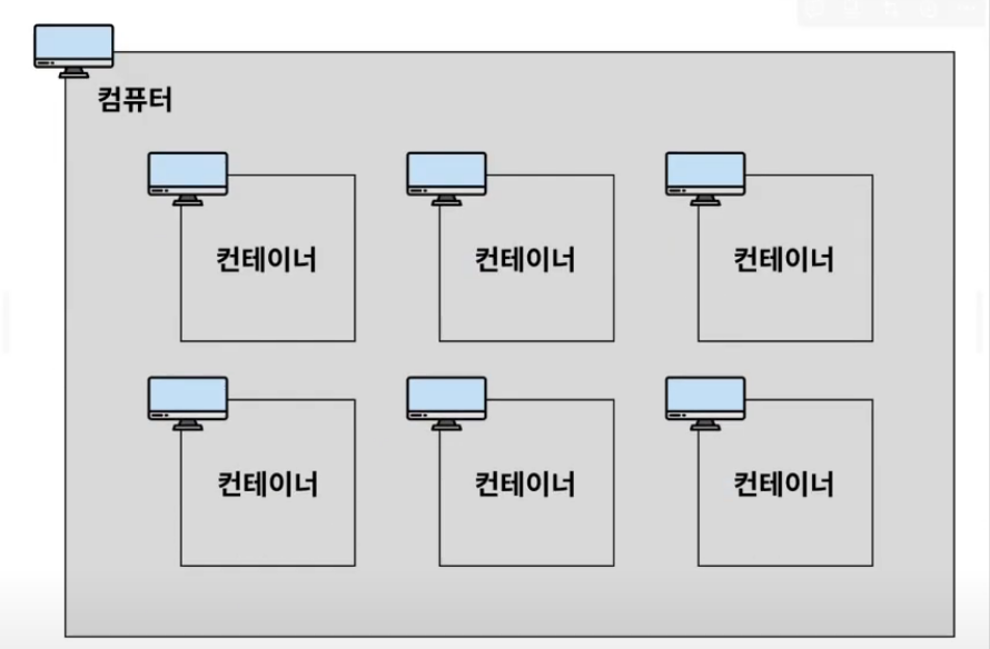Container가 이러한 다중 사용자와 비슷한 개념이다. 하나의 컴퓨터 환경 내에 여러개의 미니 컴퓨터 환경을 구성할 수 있는 형태이다. 여기서의 미니 컴퓨터가 Container의 역할이다.