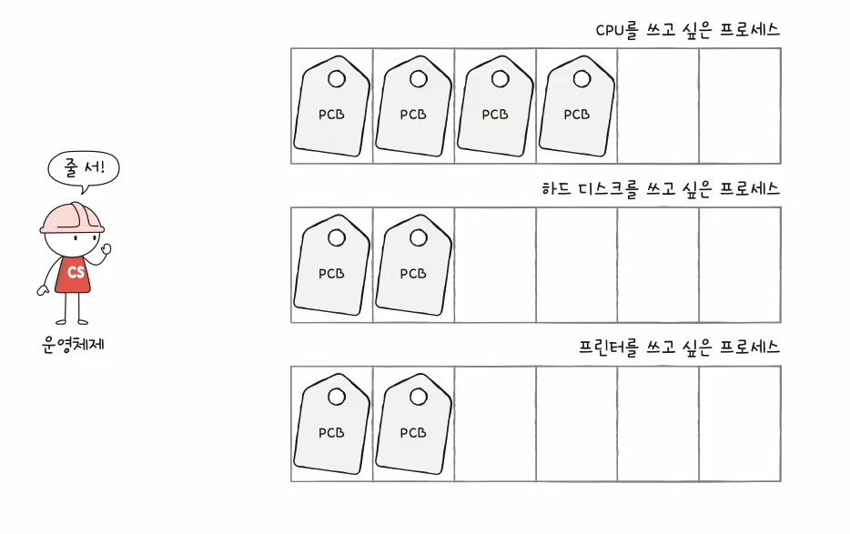 - 다음과 같이 CPU를 쓰고 싶은 프로세스/스레드의 PCB, 하드디스크를 쓰고 싶은 프로세스/스레드의 PCB, 프린터를 쓰고 싶은 프로세스/스레드의 PCB를 큐에 삽입하여 줄 세운다.