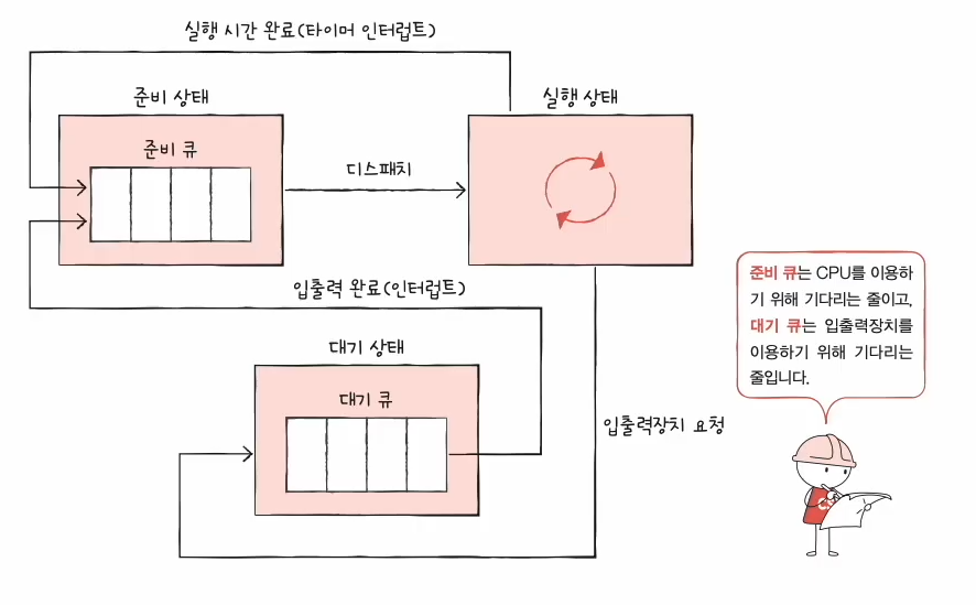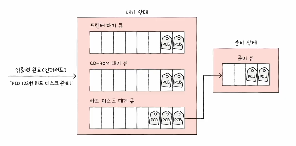 실행 도중 입출력 작업을 수행하는 등 대기 상태로 접어들어야 할 경우 대기 큐로 이동하여 입출력 작업이 끝날 때까지 입출력 완료 인터럽트를 기다린다.