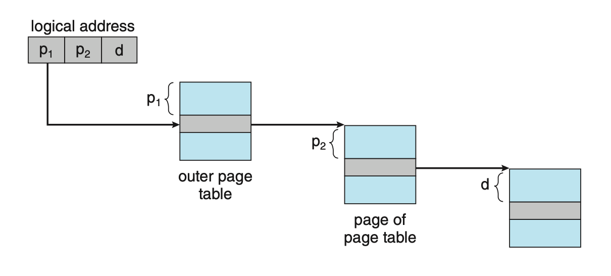 - 페이지 테이블을 여러 개의 페이지로 자르고, CPU와 가장 가까운 바깥 쪽에 페이지 테이블(Outer 페이지 테이블)을 하나 더 두어 잘린 테이블 페이지들을 가리키게 한다.