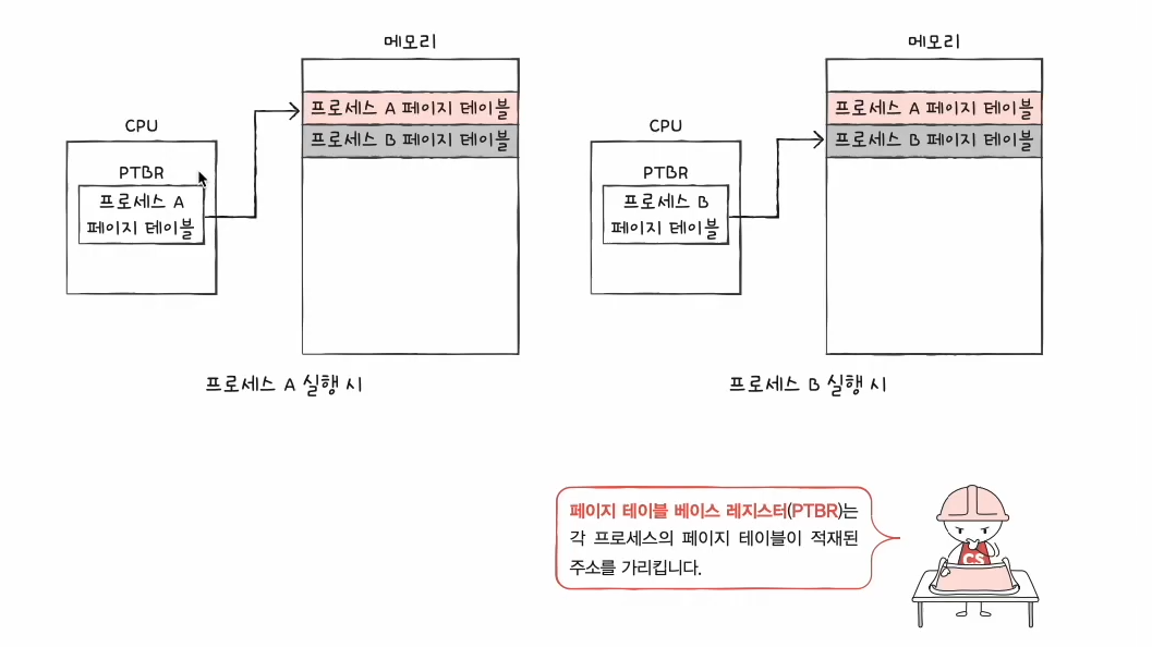 - 프로세스마다 각기 다른 페이지 테이블이 메모리 내 서로 다른 위치에 존재하기 때문에, 프로세스를 실행할 때마다 페이지 테이블 위치를 나타내는 레지스터가 필요