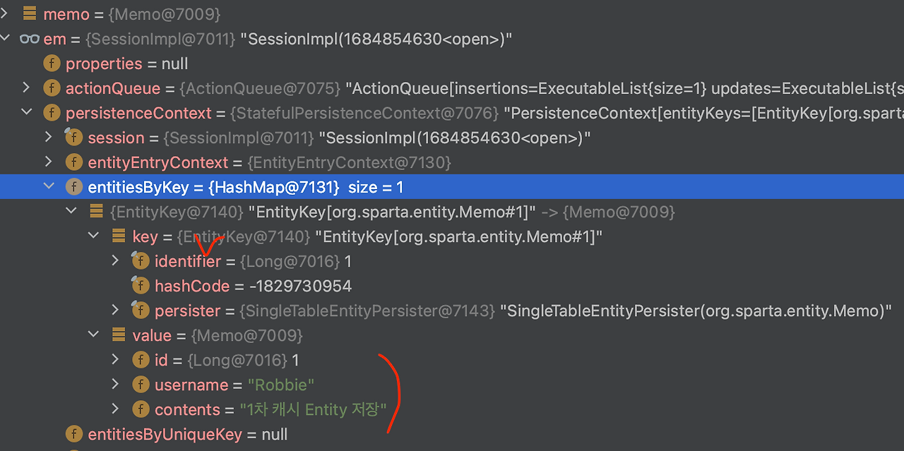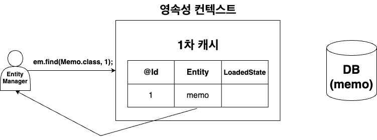 - em.find(Memo.class, 1); 호출 시 캐시 저장소에 식별자 값이 1이면서 Memo Entity 타입인 값이 있는지 조회한다.